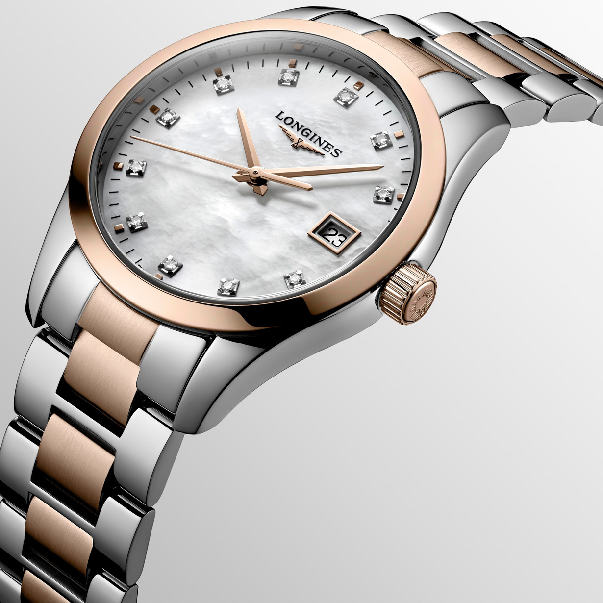 Корпус: Нержавеющая сталь марки 316L, поверхности с матовой шлифовкой сатинированием и глянцевой полировкой. Безель и заводная головка с PVD-покрытием цвета розового золота. Циферблат белый перламутровый циферблат декорирован 11 бриллиантами. Аппликация часовых индексов, а также стрелки с алмазной огранкой имеют золотое покрытие и полировку. Устойчивое к царапинам сапфировое стекло с многослойным антибликовым покрытием изнутри. Водонепроницаемость 50 метров. Диаметр 34 мм.