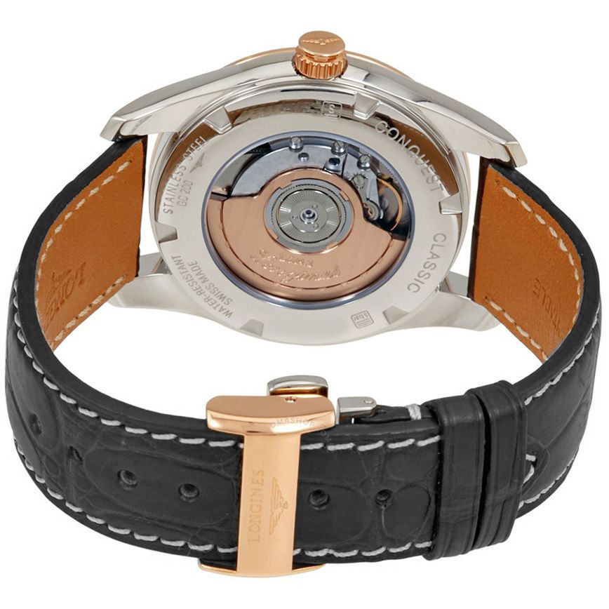Корпус: Нержавеющая сталь/розовое золото, сапфировое стекло с антибликовым покрытием. Диаметр 40 мм, водонепроницаемость 50 метров. Циферблат – черный.