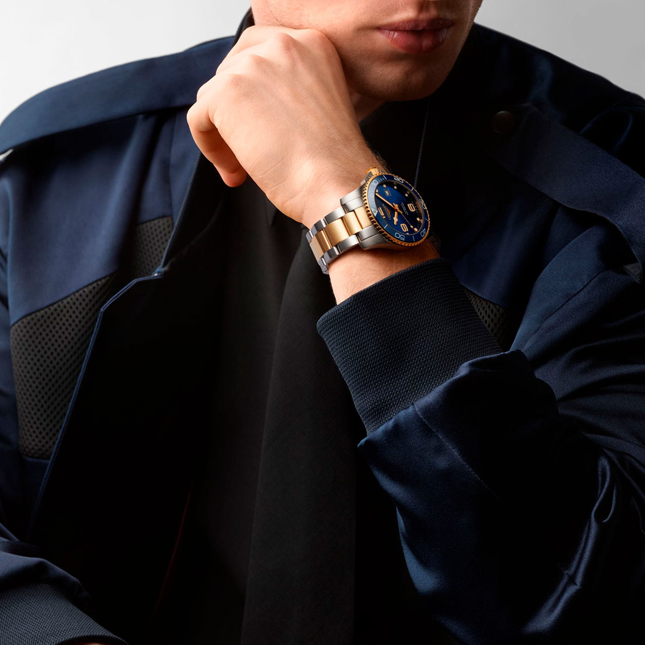 Корпус: Корпус из нержавеющей стали. Синий циферблат. Сапфировое стекло с антибликовым покрытием. Светонакопитель на индексах и стрелках. Завинчивающиеся задняя крышка и заводная головка. Однонаправленно вращающийся безель из синей керамики и стали с PVD-покрытием из желтого золота. Диаметр 41 мм. Водозащита 300 м.