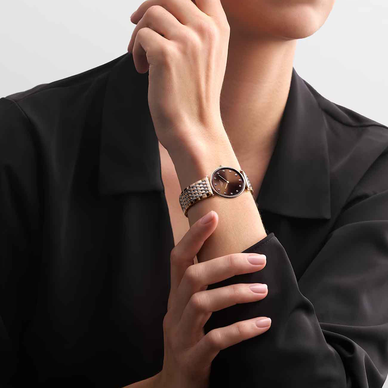 Корпус: Корпус выполнен из высококачественной стали с повышенной устойчивостью к коррозии, поверхности с матовой шлифовкой – сатинированием и полировкой до зеркального блеска с частичным PVD- покрытием из розового золота. Циферблат Sunray brown с 12 бриллиантами группы Top Wesselton VS-SI общим весом 0.081 карата. Cтрелки: полировка до алмазного блеска. Сапфировое стекло. Диаметр: 29 мм. Водостойкость: 30 м.