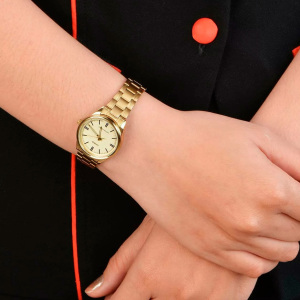 Корпус: Корпус часов выполнен из гипоаллергенной латуни с IP покрытием. Круглые женские часы, светлый циферблат. Метки в виде штрихов. Прочное минеральное стекло обеспечит защиту часов от повреждений. Габаритные размеры: 28,2x34мм, толщина 7,5мм, вес 52г. Водонепроницаемость: 30 м.