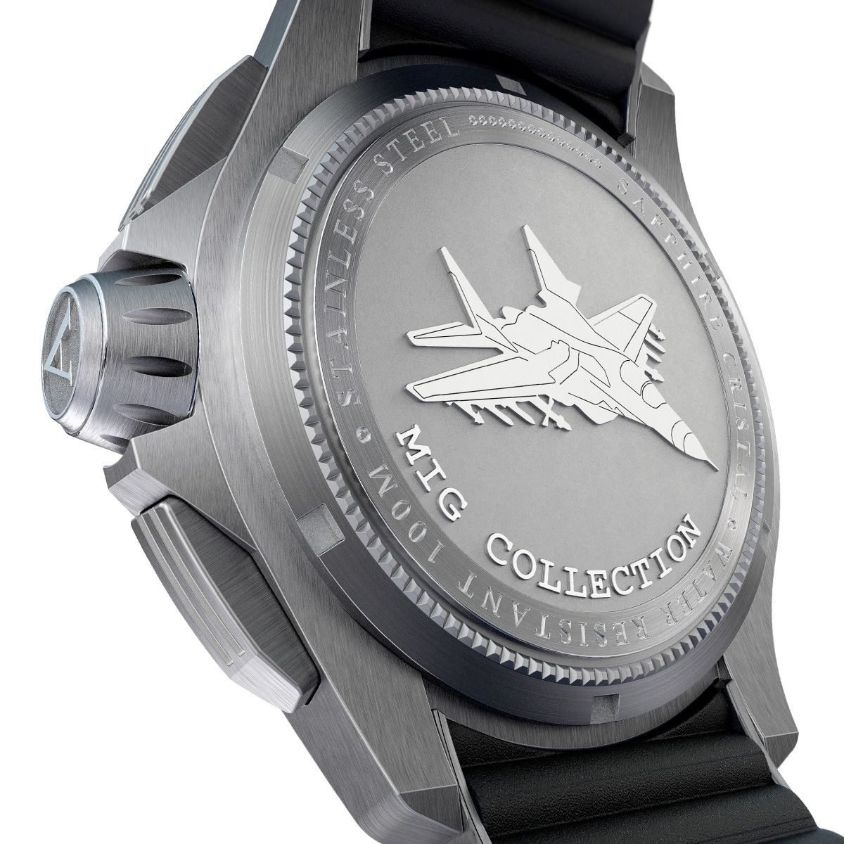 Корпус: Массивный корпус имеет изгибы напоминающие крылья самолёта и выполнен из нержавеющей стали марки 316L с матовой обработкой. Рельефный безель с черным PVD покрытием и гравированными цифрами разметки. Общий вид заводной головки и кнопок похож на вид аэродинамической кривой фюзеляжа. Переводная коронка часов выполнена в форме сопла реактивного двигателя МИГ-35 и имеет винтовую фиксацию. Задняя крышка с гравировкой и объемным изображением МИГ-35. Сапфировое стекло с двусторонним антибликовым покрытием. Циферблат черного цвета стилизован под приборную панель истребителя, поверхность с гильошированием в виде фирменного узора. На стрелки и часовые метки нанесен фотолюминесцентный состав SuperLuminova. Диаметр корпуса 45 мм, толщина 14,6 мм. Водонепроницаемость 100 метров.