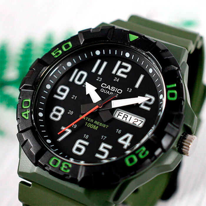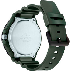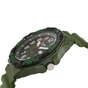 Корпус: Корпус изготовлен из полимерного пластика. Чёрный циферблат. Стрелки и цифры покрыты люминесцентным напылением. Необритовое светонакопительное покрытие обеспечивает длительное послесвечение в темноте даже после кратковременного нахождения на свету. Пластиковое стекло обеспечит защиту часов от повреждений. Однонаправленный вращающийся безель. Заводная головка с защитой. Стальная задняя крышка крепится на 4-х винтах. Диаметр 52 мм. Водонепроницаемость 100 м.