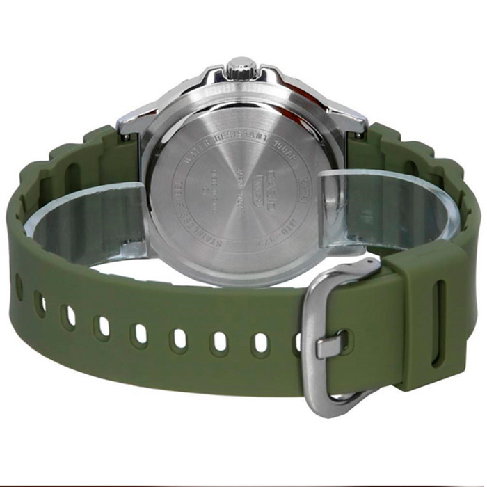 Ремешок: Натуральный полимерный материал является идеальным для изготовления ремешка благодаря своей чрезвычайной прочности и гибкости, зелёного цвета. Классическая застёжка.