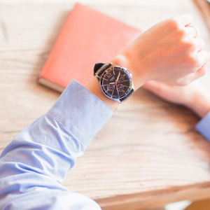 Ремешок: Кожаный ремешок чёрного цвета, стандартная застежка.