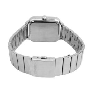 Корпус: Прямоугольный корпус хромированного цвета из нержавеющей стали. Циферблат чёрного цвета. Стрелки, метки в виде штрихов и арабской цифры серебристого цвета. Минеральное стекло защищает циферблат от повреждений. Габаритные размеры: 34х44,5мм, толщина 9,3мм. Водозащита: 5 ATM.