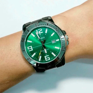 Корпус: Корпус часов выполнен из гипоаллергенной латуни с хромированным покрытием. Циферблат выполнен по технологии Sunray (солнечные лучи) зеленого цвета. Часовые индексы в виде штрихов и цифр. Необритовое светонакопительное покрытие, нанесенное на стрелки и индексы, обеспечивает длительное послесвечение в темноте даже после кратковременного нахождения на свету. Минеральное стекло защищает циферблат от повреждений. Габаритные размеры: 45x49мм, толщина 10,3мм. Водозащита: 5 ATM.