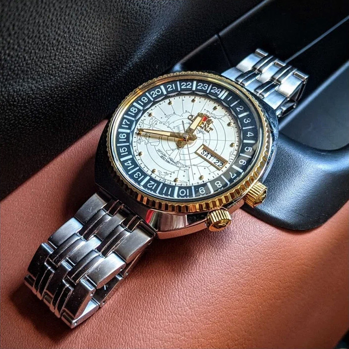 Корпус: Корпус из нержавеющей стали с IP покрытием цвета желтого золота по безелю. Циферблат цвета слоновой кости с метками в виде точек украшен изображением карты мира. Минеральное стекло крайне устойчиво к повреждениям. Диаметр корпуса: 44 мм. Толщина: 14 мм. Водонепроницаемость: 200 м.