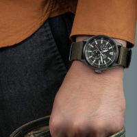 Корпус: Нержавеющая матовая сталь с PVD покрытием чёрного цвета. Тёмный циферблат. Фотолюминесцентный состав на стрелках и на разметке циферблата. Минеральное стекло. Заводная головка с защитой. Завинчивающаяся задняя крышка. Диаметр 42 мм. Водонепроницаемисть 100 м.