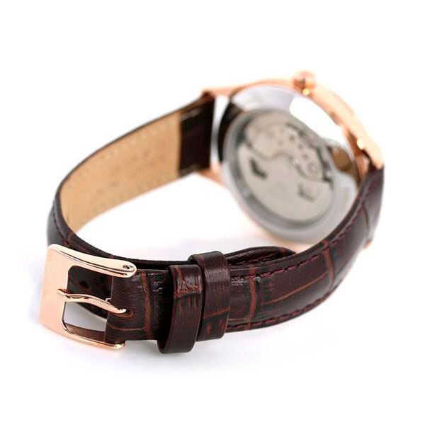 Корпус: Корпус из высококачественного стального сплава с высокими антикоррозийными свойствами и IP покрытием цвета розового золота. Циферблат коричневого цвета с открытым балансом хода. Стрелки и метками в виде штрихов золотистого цвета. Сапфировое стекло устойчивое к царапинам. Завинчивающаяся прозрачная задняя крышка. Диаметр корпуса: 35,9 мм. Толщина: 12,2 мм. Водонепроницаемость: 30 м.