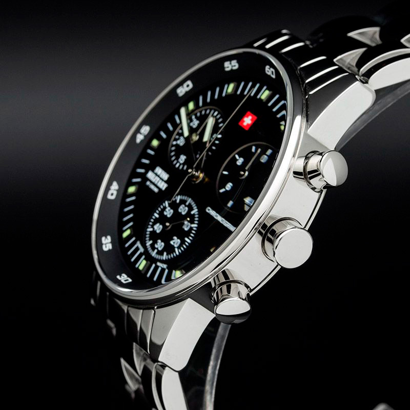 Функции: Центральные часовая и минутная стрелки, маленький секундный индикатор на «3 часах». Дата. Хронограф.