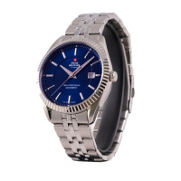 Корпус: Корпус выполнен из нержавеющей стали. Синий циферблат. Стрелки и часовые индексы из полированного металла. Минеральное стекло с сапфировым покрытием. Водонепроницаемость 50 метров. Диаметр 40 мм.