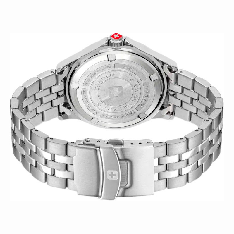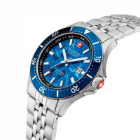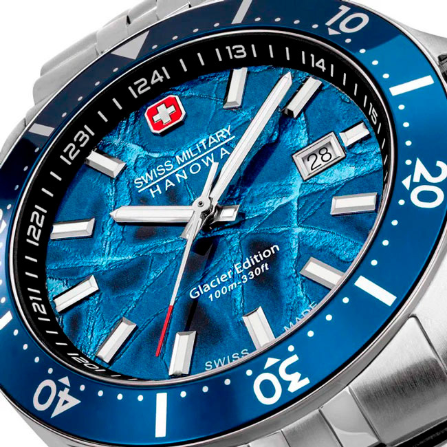 Корпус: Круглый корпус изготовлен из нержавеющей стали. Синий циферблат защищенный высокопрочным сапфировым стеклом, украшен декоративным узором в виде льдины и фирменным логотипом Swiss Military Hanowa в положении 12 часов. Метки в виде штрихов. Стрелки и метки с люминесцентным покрытием, которое светится в темноте после непродолжительной зарядки на свету. Безель с минутной шкалой. Рифленая заводная головка с защитой. Завинчивающаяся задняя крышка. Диаметр 42 мм. Водозащита 100 м.