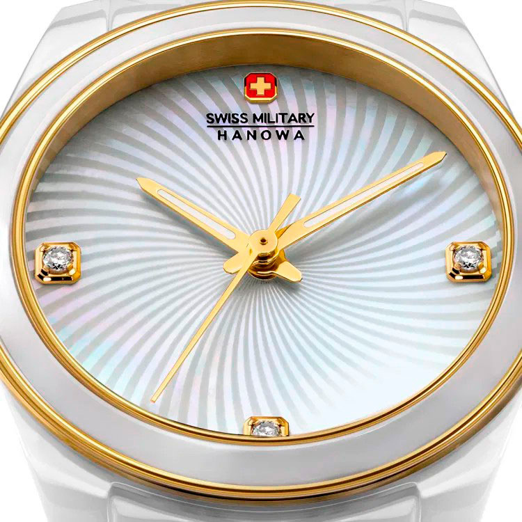 Корпус: Круглый корпус из керамики белого цвета, вставки из стали с IP покрытием. Белый перламутровый циферблат, украшен тремя искусственными бриллиантами. Позолоченные стрелки с люминесцентным покрытием, которое светится в темноте после непродолжительной зарядки на свету. Сапфировое стекло устойчивое к появлению царапин, обладающее высокой прозрачностью. Диаметр: 31,5 мм. Водонепроницаемость: 50 м.