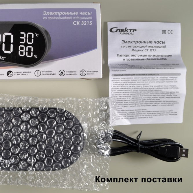 Механизм: Часы настольные с цифровой индикацией с будильником и измерением температуры и влажности. Яркость свечения часов можно плавно регулировать с помощью специального колёсика управления. Часы показывают время, температуру (можно выбрать градусы Цельсия или Фаренгейта) и влажность (%). Две центральные точки на дисплее часов не мигают. У данной модели часов сенсорные кнопки управления. Часы могут работать, в том числе, только от батареек, т.е. без подключения к внешнему источнику питания. Когда часы работают только от батареек, дисплей всё время выключен, при этом касание любой кнопки включит индикацию примерно на 10 секунд. У часов можно выставить два времени будильника. Будильник имеет нарастающую громкость сигнала и функцию повтора сигнала (snooze). Время, через которое сигнал сработает повторно, можно установить в диапазоне 5 – 30 минут, с шагом в 5 минут. Или установить равным 0, т.е. отключить функцию повтора сигнала. Питание осуществляется от порта USB. В комплекте с часами идёт USB шнур (1,5 метра) для питания часов от USB источника (5V). Для питания можно использовать, например, любой адаптер, предназначенный для зарядки мобильных телефонов, и имеющий USB выход. Блока питания от сети 220V в комплекте нет.