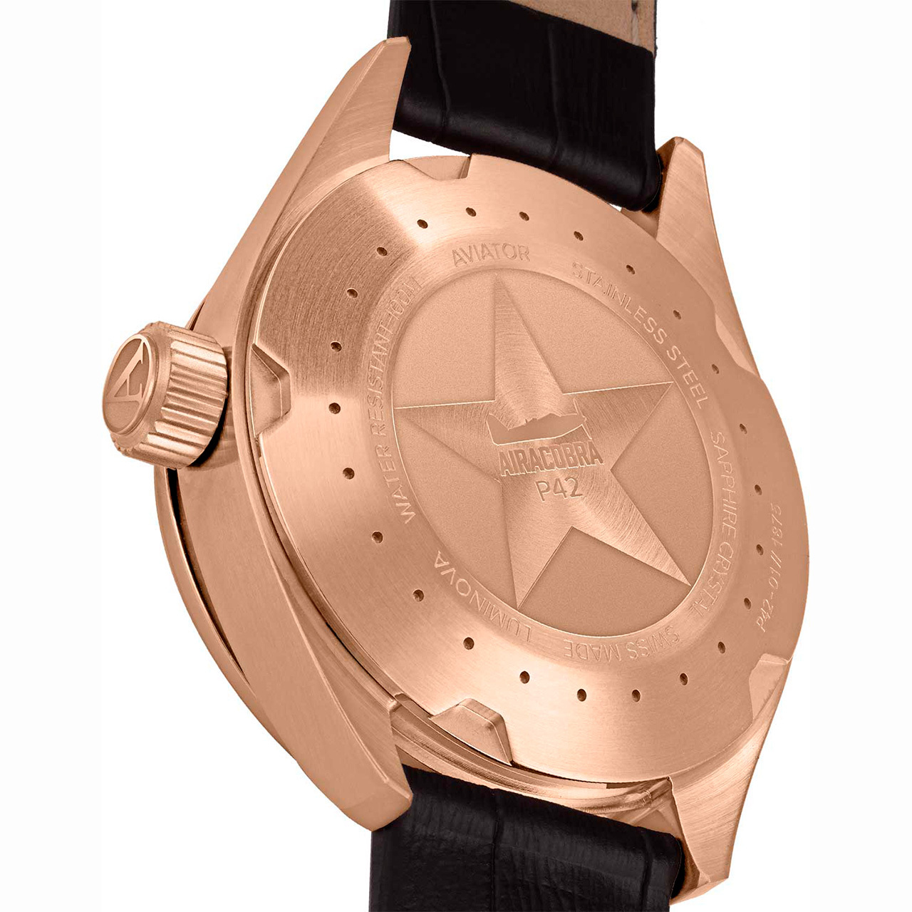 Корпус: Нержавеющая сталь с розовым PVD - покрытием. Циферблат коричневый, стрелки и часовые индексы с люминесцентным покрытием. Диаметр 42 мм. Сапфировое стекло с антибликовым покрытием. Задняя крышка имеет резьбовое соединение с корпусом. Переводная коронка с двойным уплотнителем и винтовой фиксацией для дополнительной защиты от попадания воды. Водозащита 100 метров.