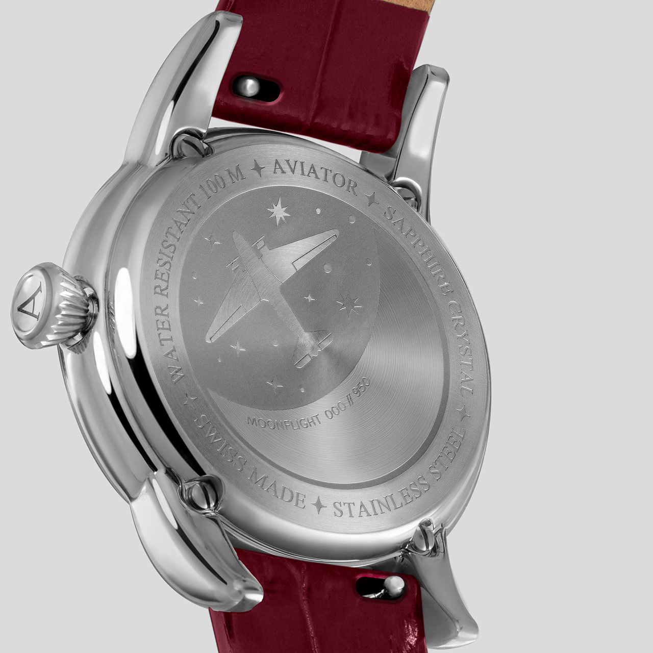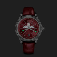 Корпус: Нержавеющая сталь марки 316L. Бордовый циферблат. Стрелки и часовые индексы серебристого цвета покрыты люминесцентным составом SuperLuminova. Облака на циферблате украшены перламутровыми вставками. Задняя крышка украшена гравировкой. Рифлёная заводная головка. Сапфировое стекло с антибликовым покрытием. Водонепроницаемость 100 метров. Диаметр 36 мм.