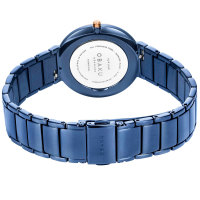 Корпус: Корпус выполнен из нержавеющей стали с IP покрытием цвета розового золота и синего. Синий циферблат. Устойчивое к возникновению царапин сапфировое стекло. Размер корпуса составляет 34 мм. Водостойкость WR 30 (брызги).