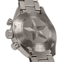 Функции: Центральные часовая, минутная и маленькая секундная стрелки, индикация даты в апертуре на отметке “4 часа”, хронограф с 30-минутным индикатором и счетчиком 1/10 секунды. Тахиметр и телеметр.