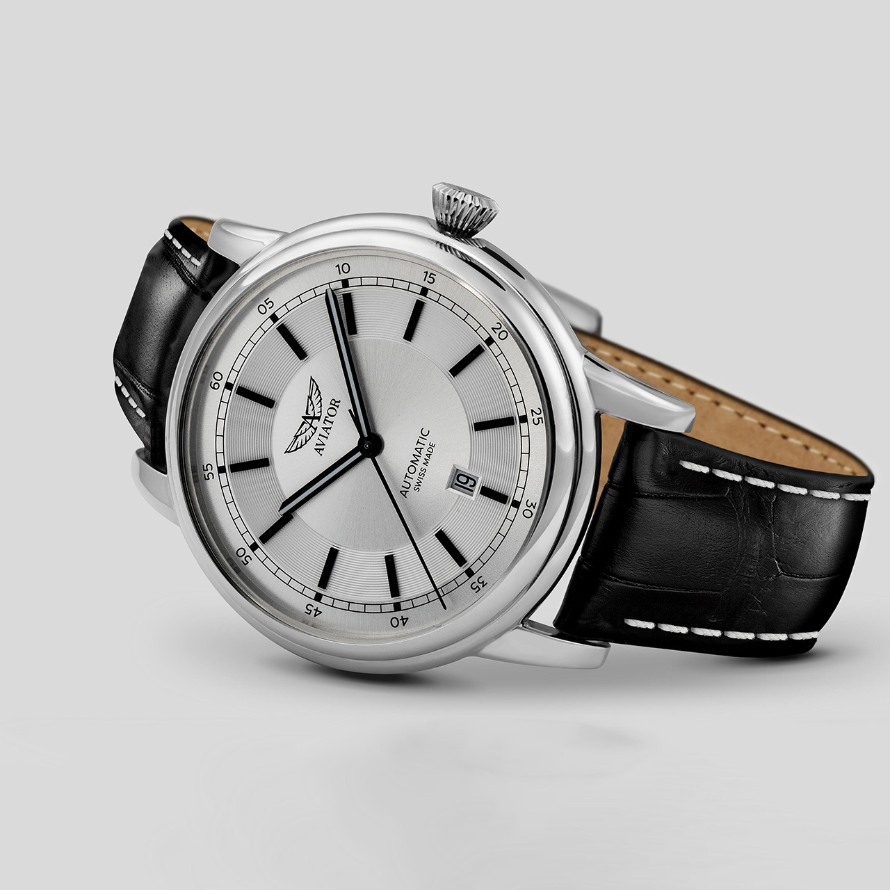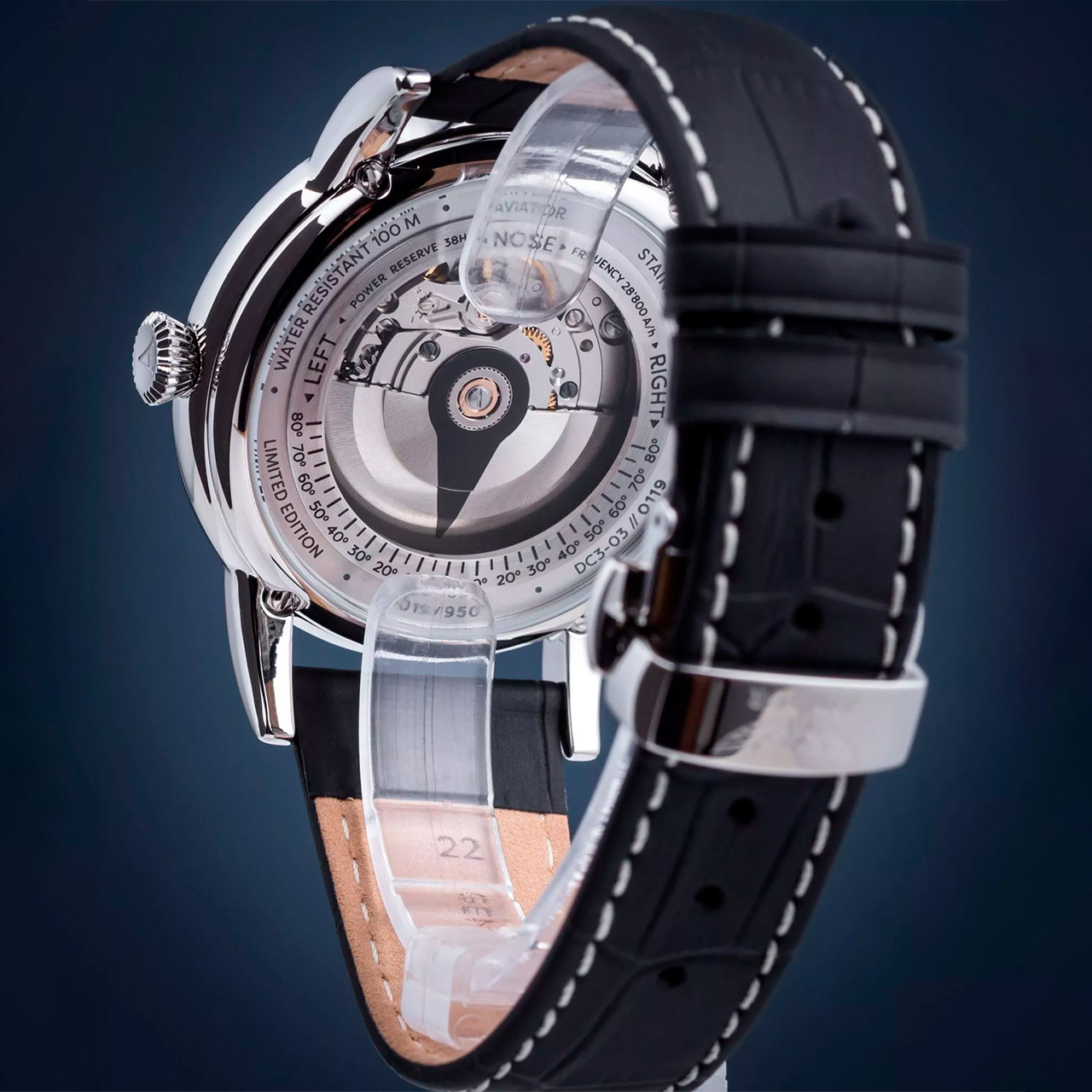 Ремешок: Черный ремешок из телячьей кожи с тиснением под аллигатора. Браслетная застежка из нержавеющей стали, раскладывающаяся при нажатии кнопок двойной блокировки.