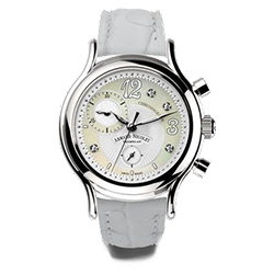 Каждая деталь является результатом поиска элегантности: красивый гильошированный циферблат украшен вставками из перламутра с бриллиантами в качестве часовых меток. Перламутровый циферблат выполнен в четырех цветах, соответствующих оттенкам кожаного ремешка с рисунком аллигатора на застежке-молнии S/S 316L, что подчеркивает изысканный дизайн.
