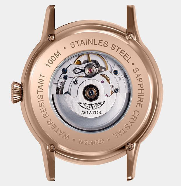Корпус состоит из трех симметричных частей: безеля, корпуса, задней крышки. Его округлые изгибы, отделанные вручную в тонких часовых техниках, вдохновлены изящной утонченностью фюзеляжа самолета Douglas. Его потрясающие, зеркально отполированные поверхности обтекаемы эргономичными гладкими линиями. А его изогнутые выступы олицетворяют собой элегантность прошлых лет, обеспечивая при этом правильную посадку на любом запястье. Как и все случаи с часами AVIATOR, он требует более 40 операций, чтобы не отставать от строгих маршрутов.