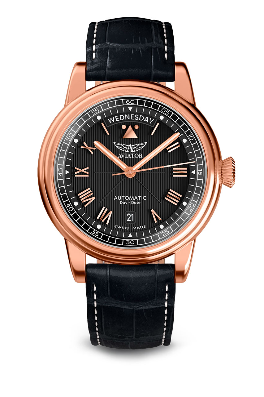 На переливающемся циферблате часов AVIATOR Douglas Day Date применена отделка в технике 3D, которая представляет собой объемный узор в виде глубоких вертикальных линий, а также объемные знаки и надписи. В изящно изогнутом окошке отображаются дни недели, также имеется закругленное окно для индикации даты. Читаемость циферблата является неотъемлемым элементом часов AVIATOR Douglas DayDate 41. Они удачно совмещают стиль ар-деко с элементами функциональности. Отполированные до совершенства крупные металлические римские цифры и многоуровневые кольца с индексами со светомассой SuperLuminova и минутной шкалой позволяют быстро и легко считывать информацию. Все это делает модель вневременным образцом часового искусства.