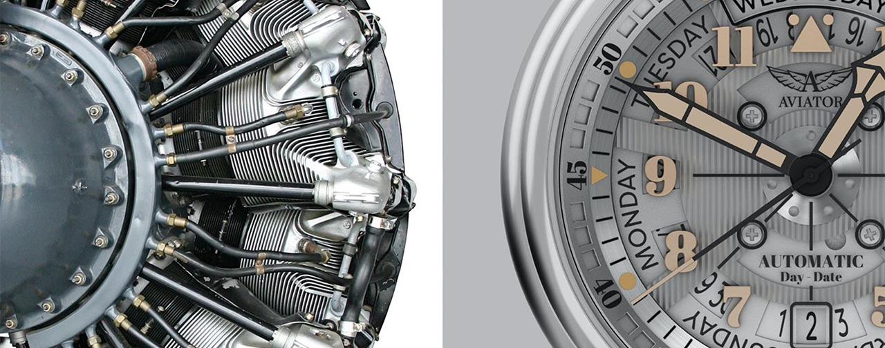 Центральная часть циферблата повторяет образ поршневого кольца и желоба двигателя. Глубокие рельефные линии в центральной части циферблата такие же, как поршневые кольца и желоба двигателя самолета.