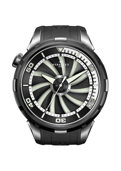 Perrelet в этом году в Базеле были на своей волне - их турбину все узнают сразу. Компания представила новую модель Turbine Diver. Необычность в том, что верхний ротор с 11 закругленными лопастями напоминает гребной винт. Когда он свободно вращается над покрытой составом SuperLuminova поверхностью, создается эффект свечения циферблата, который усиливается в сумерках или при погружении на глубину. Есть вариант сдержанный черный, а есть более экспрессивный - синий с желтым.