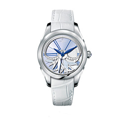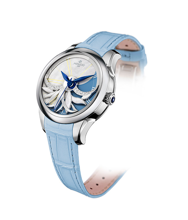 Цвет привлек дизайнеров Perrelet и вылился в итоге в очень красивую коллекцию Diamond Flower Amytis. Этот швейцарский часовой дом славится оригинальностью своих циферблатов, которые «оживляют» запатентованный в 1995 году двойной ротор - фирменный знак бренда. Но в новой коллекции часы стали еще более художественными, а циферблат выдержан в нежнейших оттенках кремового и голубого.