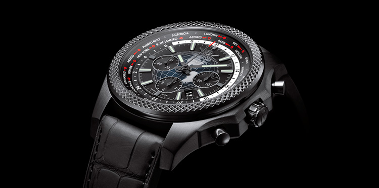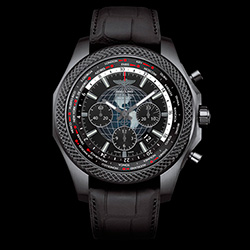 Ограниченным тиражом 500 экземпляров вышел хронограф Bentley B05 Unitime в версии с черным корпусом из матовой стали. Breitling не первый год сотрудничает с престижной автомобильной маркой, и каждый раз союз выливается в нечто особенное. Эффектность достигается за счет нанесения высокопрочного покрытия на углеродной основе, черного циферблата с выпуклым узором в виде земного шара и совершенно нового ремешка, в котором каучуковая основа дополнена внешним слоем из матовой крокодиловой кожи.