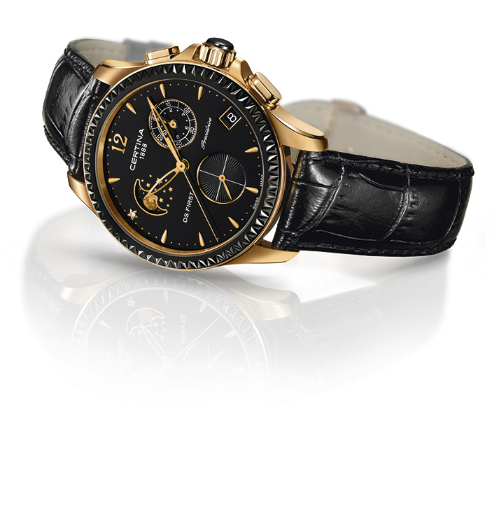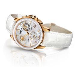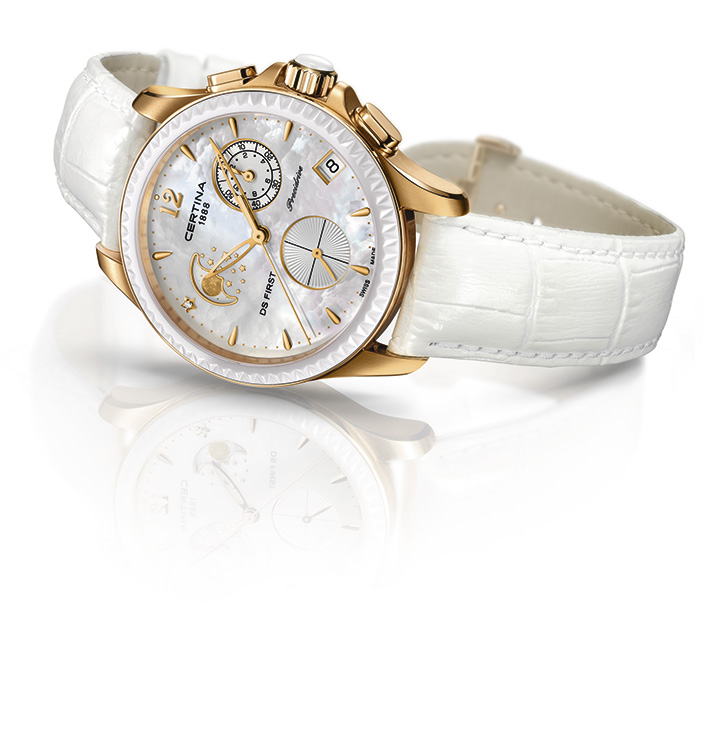 На стенде Сertina обратила на себя внимание DS First Lady Moon Phase – в данном сегменте аналога по функционалу я не вижу. Часы оснащены великолепным кварцевым механизмом Precidrive™ с функциями хронографа и индикацией фаз Луны. Все усложнения заключены в стильный 38-мм корпус с покрытием из розового золота в комбинации с матовыми и полированными поверхностями.