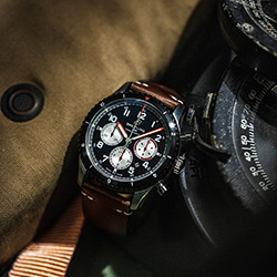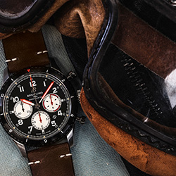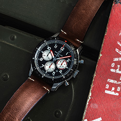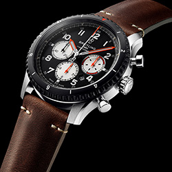 На яркую центральную часовую стрелку оранжевого цвета, а также минутную и центральную секундную стрелки нанесено люминесцентное покрытие по технологии Super-LumiNova®, которое гарантирует удобство считывания времени при любом уровне освещенности. Динамичные красно-оранжевые акценты напоминают опознавательные знаки на фюзеляже самолетов de Havilland Mosquito и подчеркивают уникальный характер модели. Стрелка малого секундного счетчика покрыта черным лаком. На циферблате в положении между «4» и «5» часами находится окошко индикации даты.