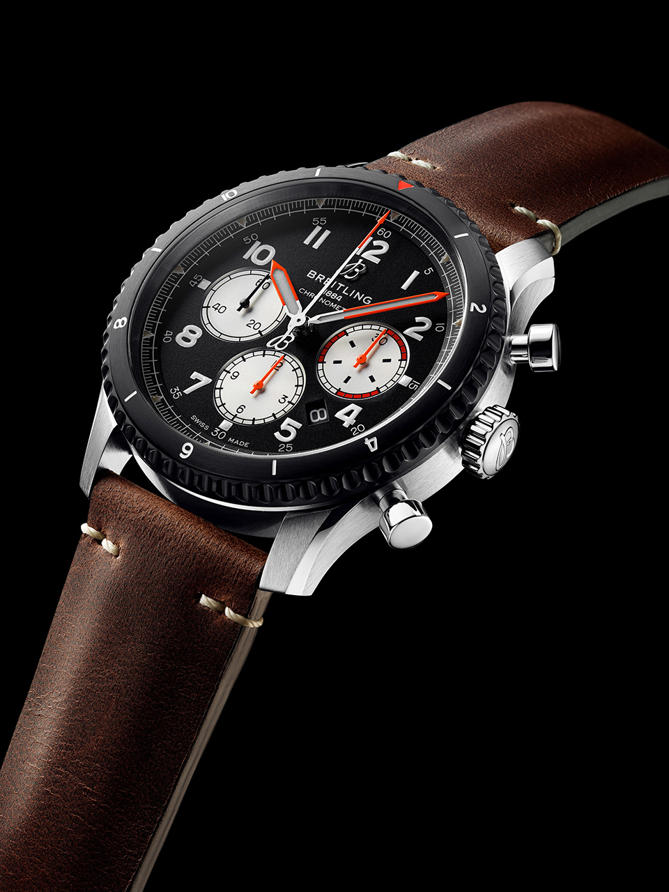 43-миллиметровый корпус Aviator 8 Mosquito выполнен из нержавеющей стали и украшен стальным сатинированным безелем с высокопрочным углеродным покрытием ADLC. Удобство считывания показаний обеспечивают ярко-красный указатель, индексы и арабские цифры. На черном циферблате выделяются серебристые счетчики, которые говорят о том, что внутри корпуса находится мануфактурный калибр Breitling Manufacture Calibre 01. Как правило, при использовании традиционного покрытия DLC корпус часов приобретает антрацитовый оттенок. Во многом благодаря ему специальные модели Breitling пользуются большой популярностью уже многие годы. Однако в данном случае было применено высокопрочное углеродное покрытие ADLC, придающее корпусу глубокий черный цвет. Он напоминает об одной из функций de Havilland Mosquito, который нес службу и в качестве ночного истребителя.