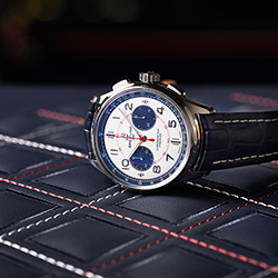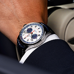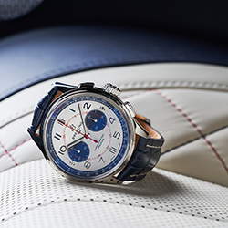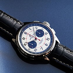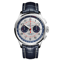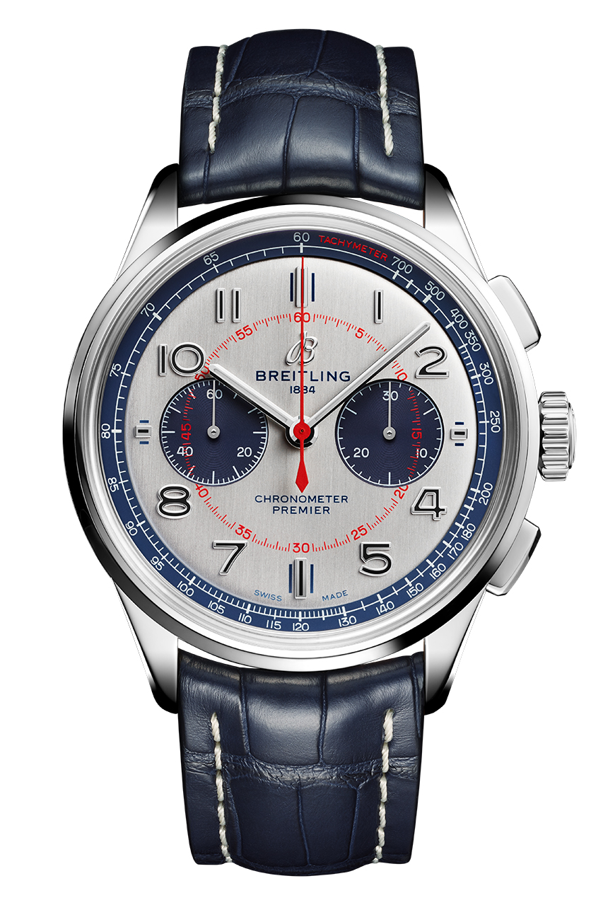 Лимитированная серия Premier Bentley Mulliner Limited Edition ограничена всего 1000 экземплярами. Корпус из нержавеющей стали диаметром 42 мм дополнен синим ремешком из кожи аллигатора: он отлично гармонирует с цветом Imperial Blue в отделке салона автомобиля. Элегантный серебристый циферблат повторяет дизайн бортовых часов, установленных на приборной панели кабриолета Bentley Continental GT Mulliner Convertible. Дополнительные циферблаты синего цвета (30-минутный счетчик и циферблат с малой секундной стрелкой в положениях «3 часа» и «9 часов» соответственно) указывают на то, что под корпусом находится мануфактурный механизм Breitling Manufacture Caliber 01, запас хода которого составляет около 70 часов. Циферблат оснащен белой тахиметрической шкалой, нанесенной на синий внутренний безель, с надписью TACHYMETER красного цвета.