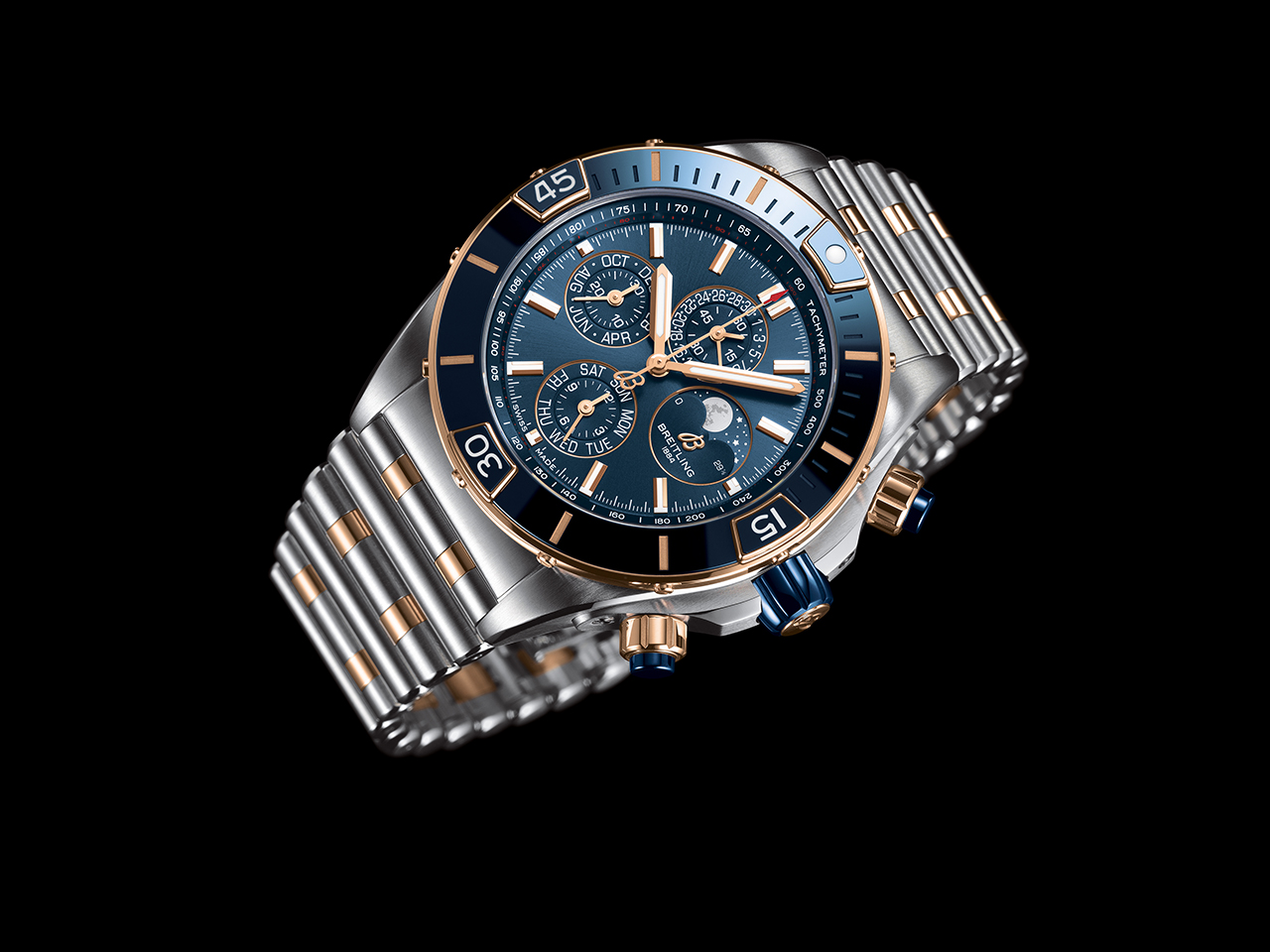 Как следует из названия модели Super Chronomat 44 Four-Year Calendar, она обладает механизмом календаря, который нужно корректировать лишь один раз каждый високосный год, или раз в 1461 день. Часы представлены в двух вариантах: с черным циферблатом и счетчиками хронографа того же оттенка, безелем из нержавеющей стали с инкрустацией из черной керамики и элементами из 18-каратного красного золота или с синим циферблатом, счетчиками хронографа того же оттенка и безелем из 18-каратного красного золота с инкрустацией из синей керамики. Модель обладает водонепроницаемостью до 100 метров, часовым механизмом хронографа Breitling 19, сертифицированным COSC, и полувечным календарем с индикаторами дня, даты, месяца и фаз Луны.