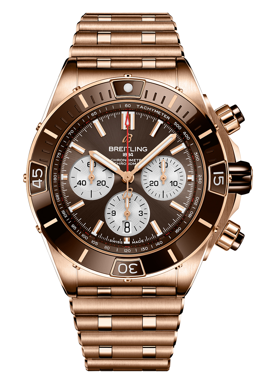 Часы Super Chronomat B01 44 выполнены в трех вариантах. Два – в корпусе из нержавеющей стали с черным или синим цветом циферблата и безеля. Третий вариант модели сочетает в себе насыщенный коричневый оттенок циферблата и безеля и корпус из 18-каратного красного золота. Все экземпляры часов оснащены контрастными серебристыми счетчиками хронографа и мануфактурным калибром Breitling 01, сертифицированным Швейцарским институтом официального тестирования хронометров (COSC) и обладающим запасом хода около 70 часов. Водонепроницаемость этой модели Super Chronomat составляет до 200 метров.