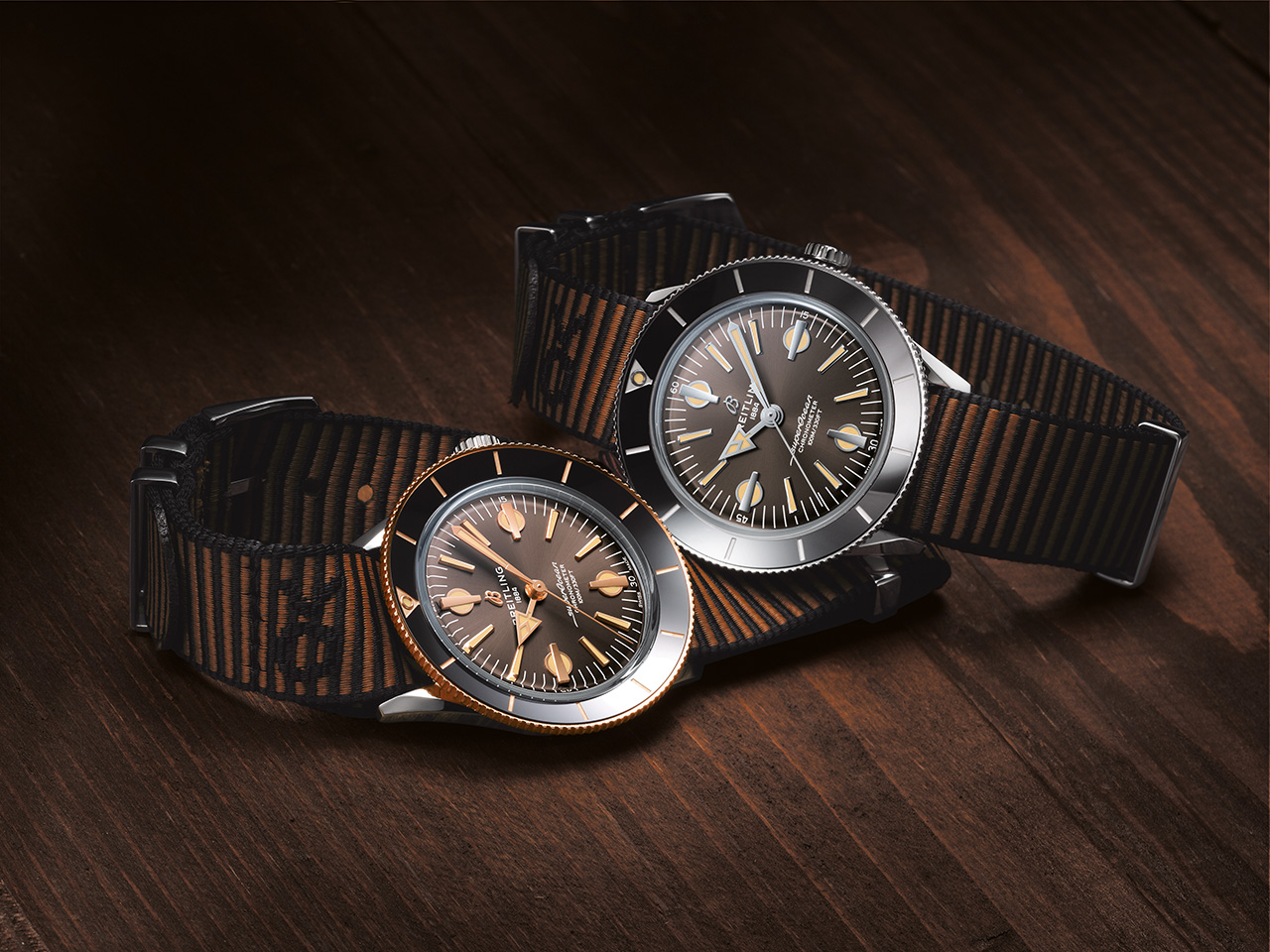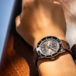 Часы Superocean Heritage ’57 Outerknown Limited Edition также обладают бронзовым циферблатом и коричневым ремешком NATO Outerknown из материала ECONYL®. Их вогнутый безель из 18-каратного розового золота, вращающийся в оба направления, эффектно смотрится на фоне черного керамического кольца. Эта модель выпущена ограниченным тиражом 500 экземпляров.
