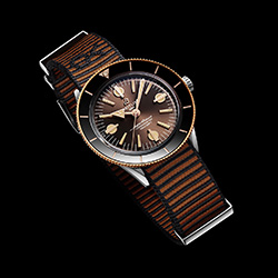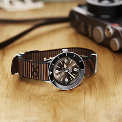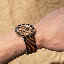 Версия из нержавеющей стали оснащена циферблатом бронзового цвета, что придает ей уникальный оттенок современного ретро. Образ дополняет коричневый ремешoк NATO Outerknown из материала ECONYL®. Вогнутый безель из нержавеющей стали, вращающийся в оба направления, оснащен ультрапрочным удароустойчивым керамическим кольцом с люминесцентной центральной меткой в положении «12 часов» – идеальный вариант для дайвинга.