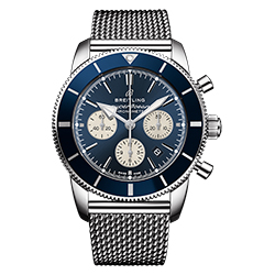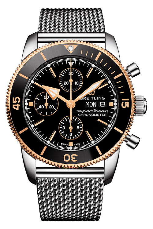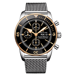 Superocean Héritage II Chronograph 44 выполнен из нержавеющей стали и представлен в двух версиях: одна ‒ с черным циферблатом и стальным браслетом Ocean Classic, вторая – с синим циферблатом и идеально дополняющим его синим каучуковым ремешком Aero Classic. Особого внимания поклонников часового искусства заслуживает модель из стали и 18-каратного красного золота с черным циферблатом. Этот роскошный хронограф представлен на стальном браслете Ocean Classic.