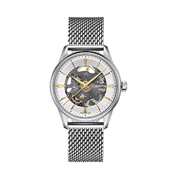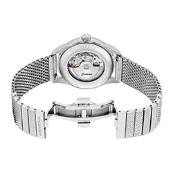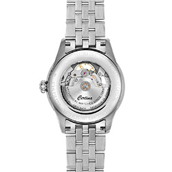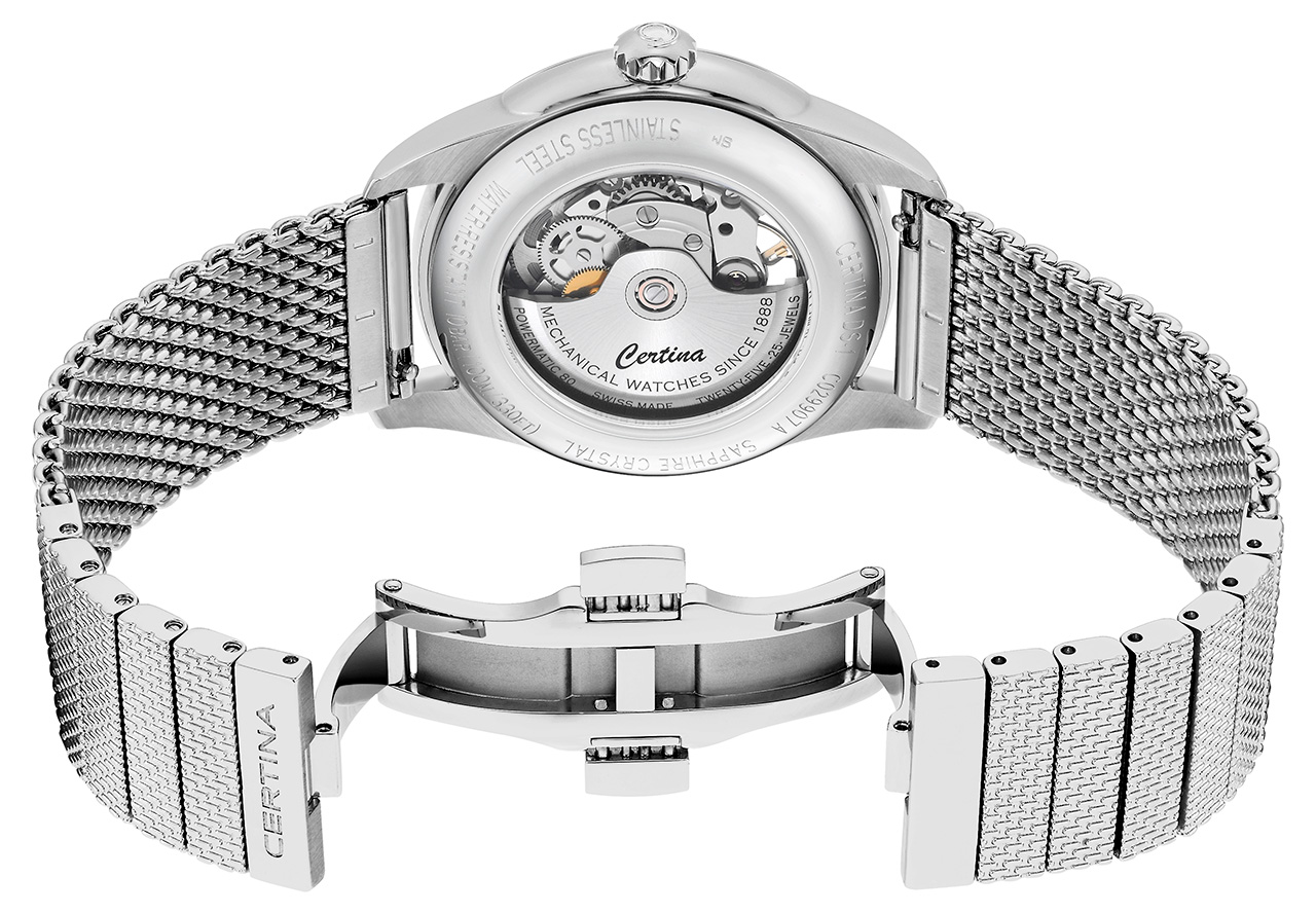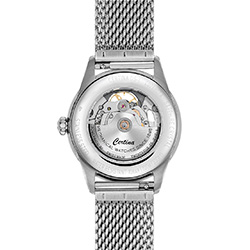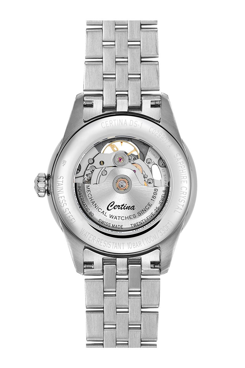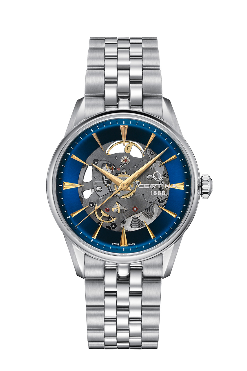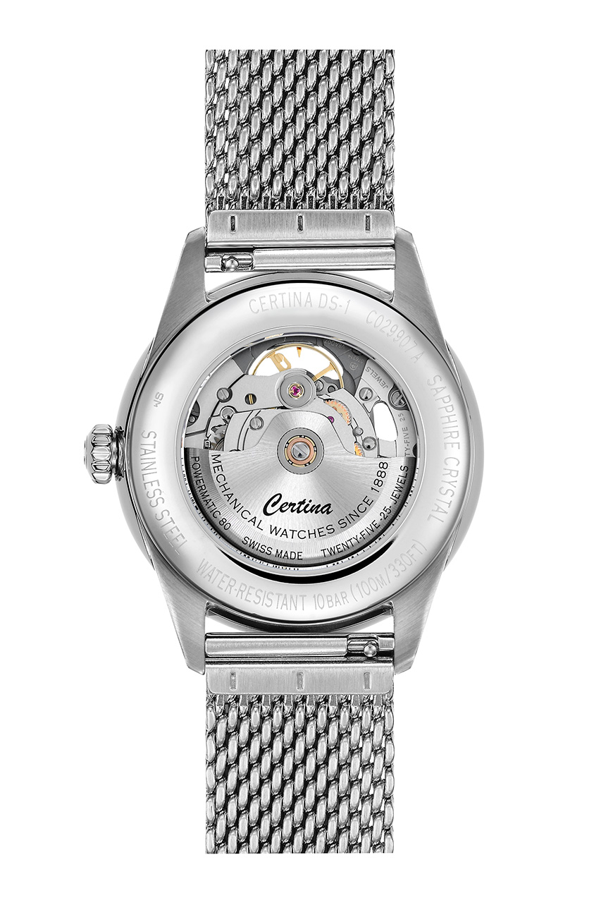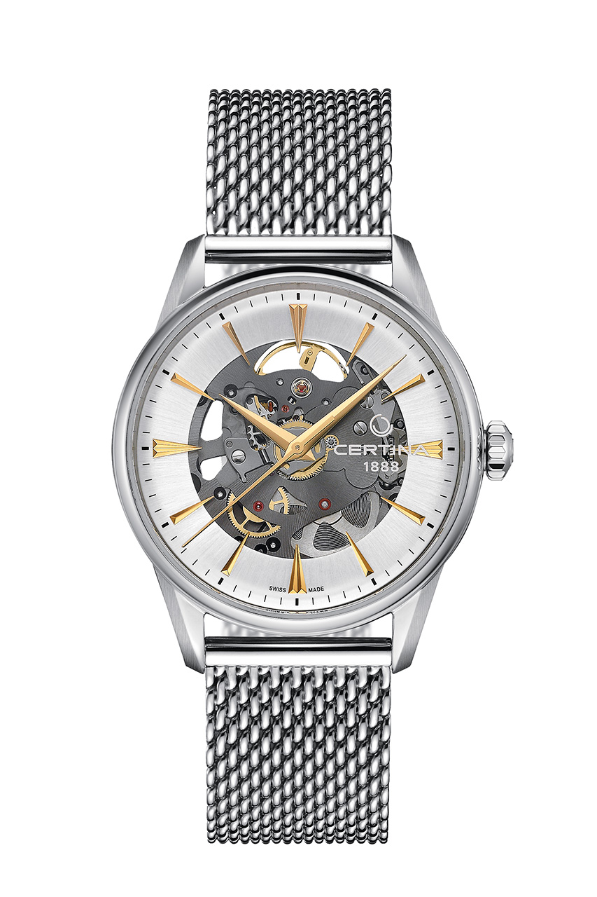 DS-1 Skeleton. Эта модель сочетает в себе эстетику минимализма классической модели Certina DS-1 и элегантный и интригующий дизайн скелетонизированного циферблата. Циферблат часов имеет круглое скелетонизированное окошко, через которое под действием магии света оживает механизм Powermatic 80, являющий «сердцем» часов.