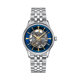 Модель с синим циферблатом дополняет пятирядный браслет из нержавеющей стали с полированными и сатинированными поверхностями.