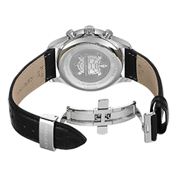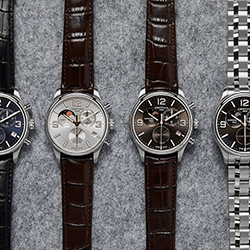 Круглый корпус из нержавеющей стали диаметром 42 мм задает стильный акцент благодаря сочетанию сатинированных и полированных поверхностей. Элегантность и ясность исполнения подчеркивает темно-синий циферблат с гильоше «Солнечные лучи». Также доступны варианты исполнения циферблата в темно-коричневом, черном или серебристом цветах. Дополнительное покрытие Super-LumiNova® на элегантных арабских цифрах и часовых отметках, а также на часовой и минутной стрелках улучшают считываемость показаний даже в темноте. Внешний вид модели дополняет ремешок из телячьей кожи с тиснением под крокодиловую кожу. Также доступны темно-коричневый кожаный ремешок или удобный стальной браслет из пяти рядов звеньев.