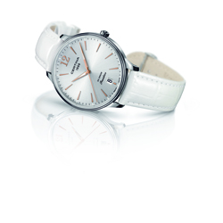 - белый ремешок имеет версия с серебристым циферблатом, метками и стрелками с PVD-покрытием розовым золотом и версия с серебристым циферблатом, чёрными никелированными стрелками и метками, 120 бриллиантами «Top Wesselton» по безелю;