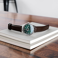 • C038.407.16.097.00 Зеленый циферблат, корпус из нержавеющей стали, темно-коричневый кожаный ремешок.