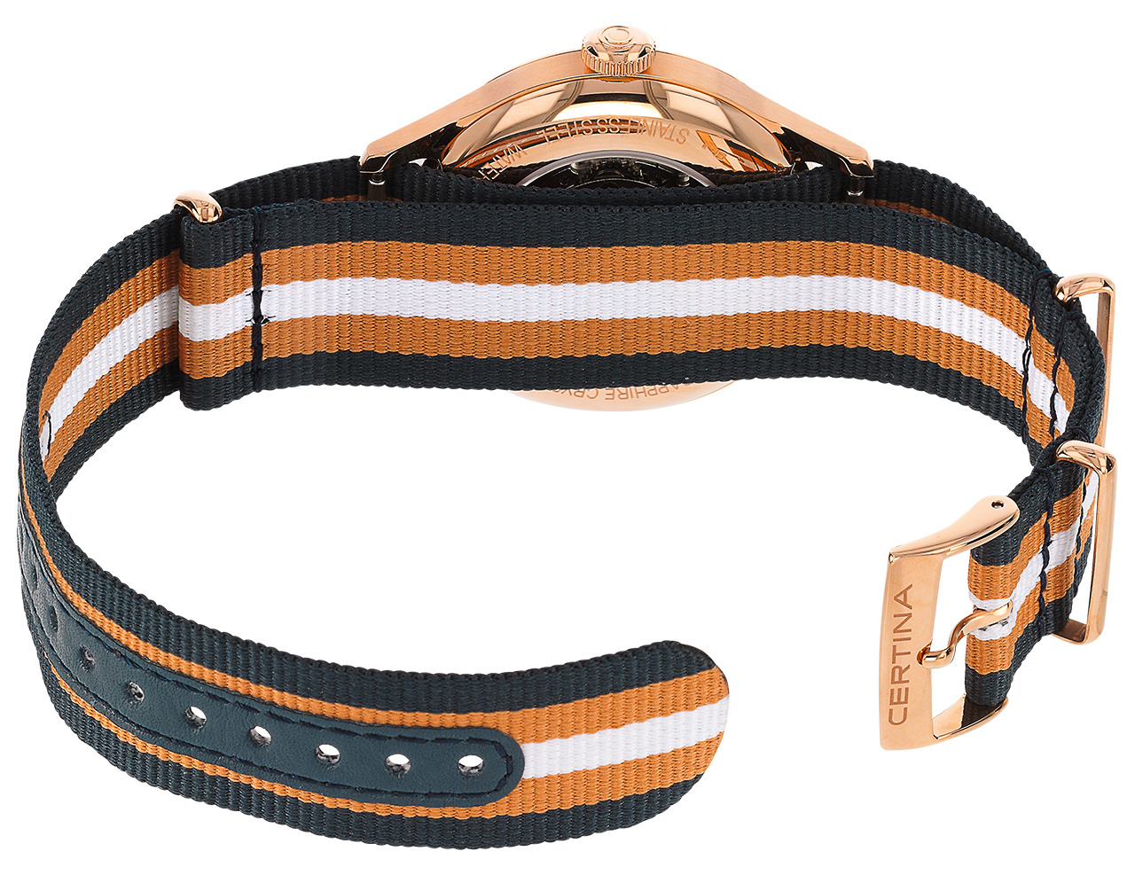 • C038.407.18.047.00 Синий циферблат, корпус из нержавеющей стали, полосатый ремешок NATO.