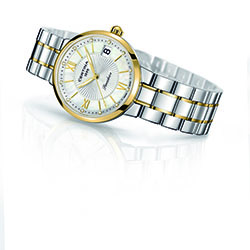 Стальной корпус и стальной браслет в стиле «биколор» с частичным PVD-покрытием жёлтым золотом, серебристый циферблат с отделкой гильоше и перламутровым цифровым полем; стрелки, римские цифры и условные индексы золотистого цвета, двенадцать бриллиантов, окошко даты.