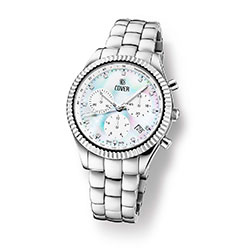 Основной акцент в дизайне сделан на перламутровый циферблат, украшенный кристаллами Swarovski, который привлекает внимание и придаёт часам особую утонченность. Элегантный рифлёный безель добавляет классический акцент, а браслет из нержавеющей стали с раскладывающейся застёжкой делает модель универсальной для повседневного ношения.
