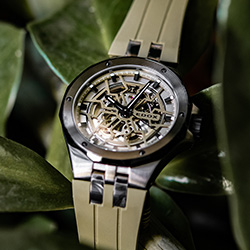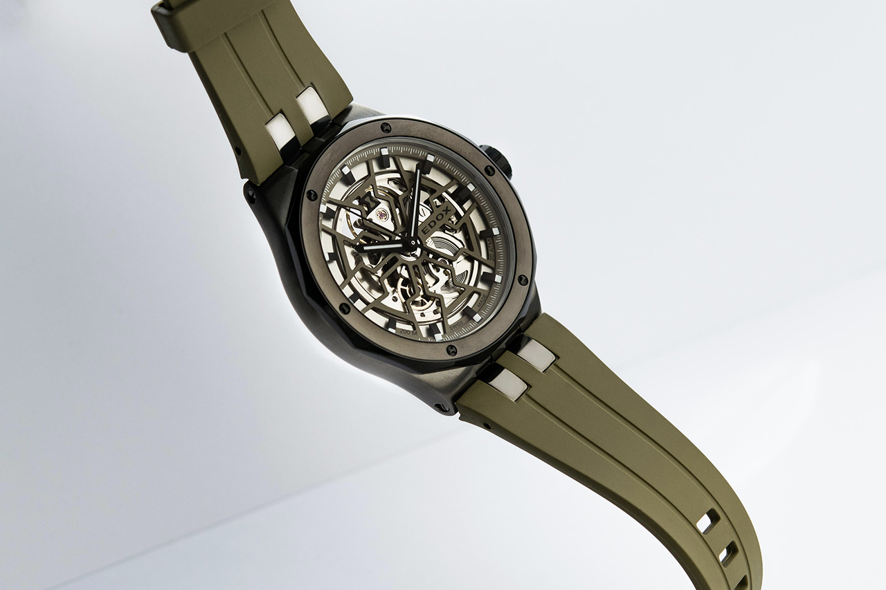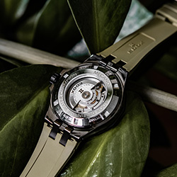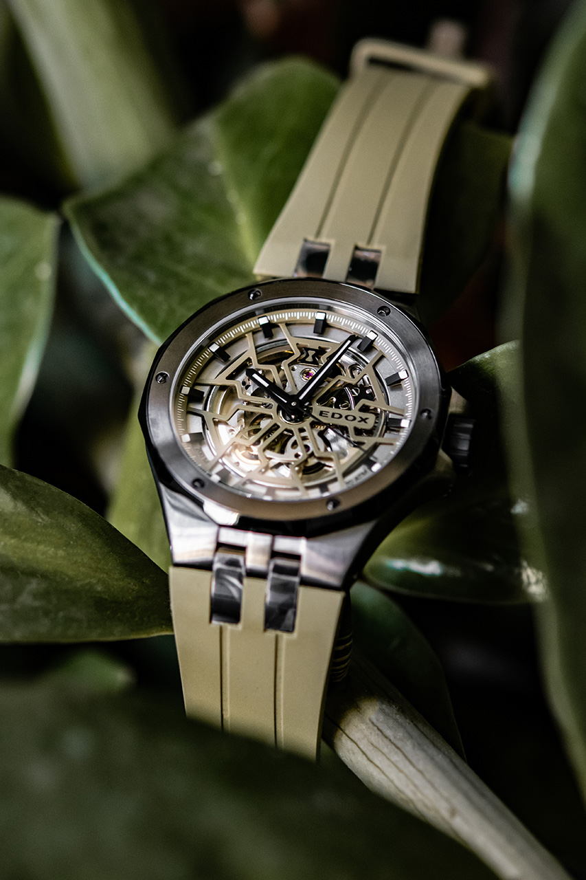 Часы Delfin Mecano от Edox стали настоящим хитом среди любителей часов по всему миру. Теперь бутик швейцарского часового производителя расширяет семейство Delfin Mecano новой моделью, выполненной в изысканной прохладной цветовой гамме. Сочетание грифельно-серого безеля и выступов в сочетании с ремешком цвета мха и скелетонизированными вставками на циферблате создает на запястье смелый, но утонченный вид часов.