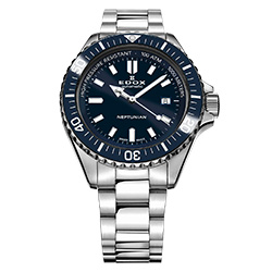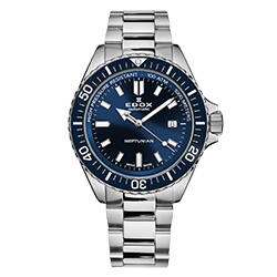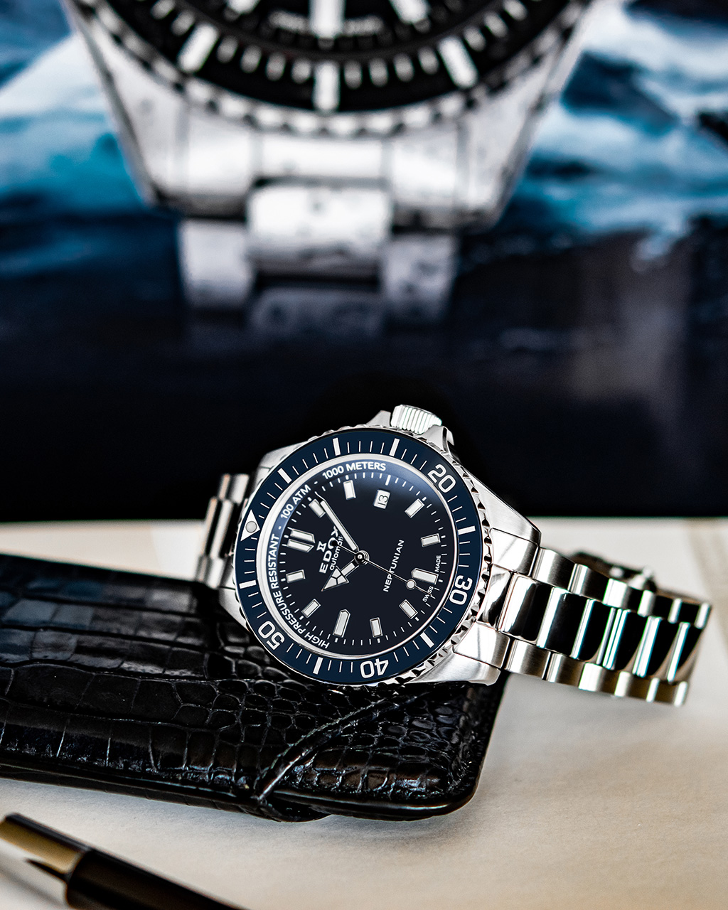 Часы Neptunian – это естественная эволюция вечной классики и еще одно яркое дополнение к семейству часов Edox Water Champions. Эти часы – настоящий «чемпион по воде». Neptunian обладает сверхпрочной конструкцией, позволяющей выдерживать не только давление на глубине, но и благодаря прочному и долговечному корпусу из нержавеющей стали все, что находится на поверхности. Водонепроницаемость часов составляет невероятные 1000 метров. Выдающаяся долговечность и надежность достигнуты благодаря нескольким инженерным усовершенствованиям, таким как сапфировое стекло толщиной 3 мм, автоматический клапан выпуска гелия, система двойного кольца и завинчивающаяся заводная головка. Сапфировое стекло защищает классический циферблат, окруженный керамическим безелем. Задняя крышка корпуса украшена яркой гравировкой с изображением Нептуна, римского бога моря. Neptunian сочетает в себе точность, выдержку экстремальных условий с элегантностью и эстетикой современного прибора для измерения времени погружения.